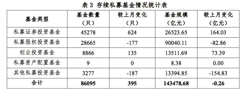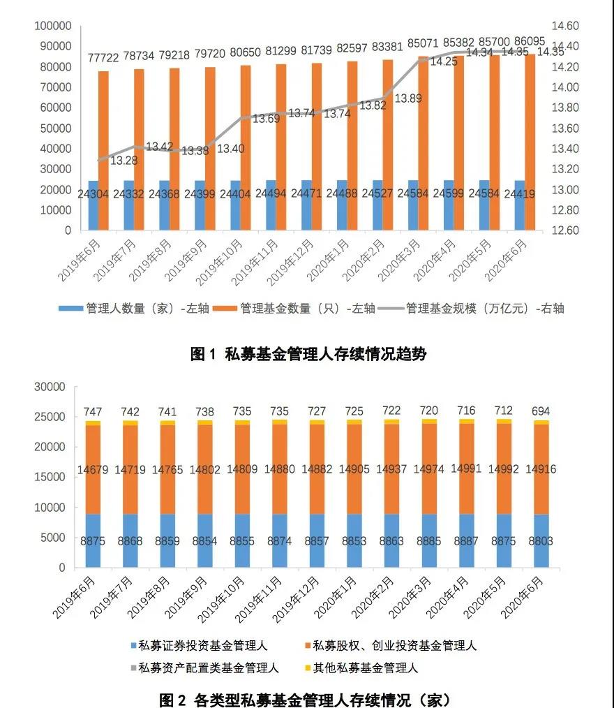 截至2020年6月末,存续私募基金管理人24419家,较上月减少165家,环比下降0.67%;管理基金数量86095只,较上月增加395只,环比增长0.46%;管理基金规模14.35万亿元,较上月减少0.26亿元,规模与上月基本持平。其中,私募证券投资基金管理人8803家,较上月减少72家,环比下降0.81%;私募股权、创业投资基金管理人14916家,较上月减少76家,环比下降0.51%;私募资产配置类基金管理人6家,较上月增加1家,环比增长20%;其他私募投资基金管理人694家,较上月减少18家,环比下降2.53%。