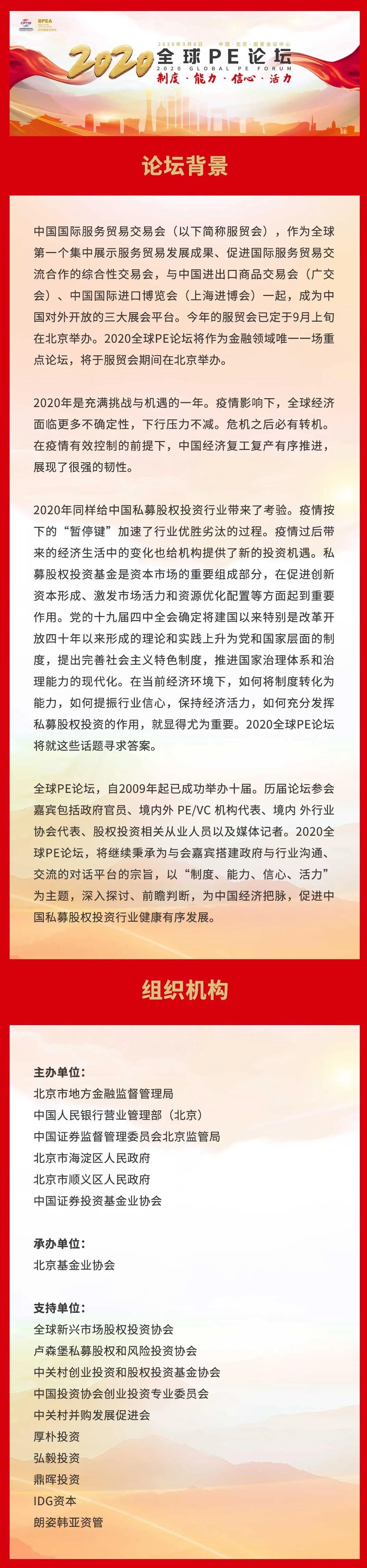 2020全球PE论坛将于9月8日开幕,协会作为本次论坛的地方支持单位,线上直播端口将免费向全体会员单位开放,欢迎大家届时收看。