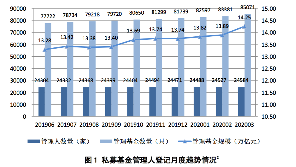 截至2020年3月底,中国证券投资基金业协会(以下简称“协会”)存续登记私募基金管理人24584家,较上月存量机构增加57家,环比增长0.23%;存续备案私募基金85071只,较上月增加1690只,环比增长2.03%;管理基金规模14.25万亿元[1],较上月增加3599.14亿元,环比增长2.59%。私募基金管理人在从业人员管理平台完成注册且处于在职状态的全职员工14.48万人,其中取得基金从业资格的员工13.49万人。