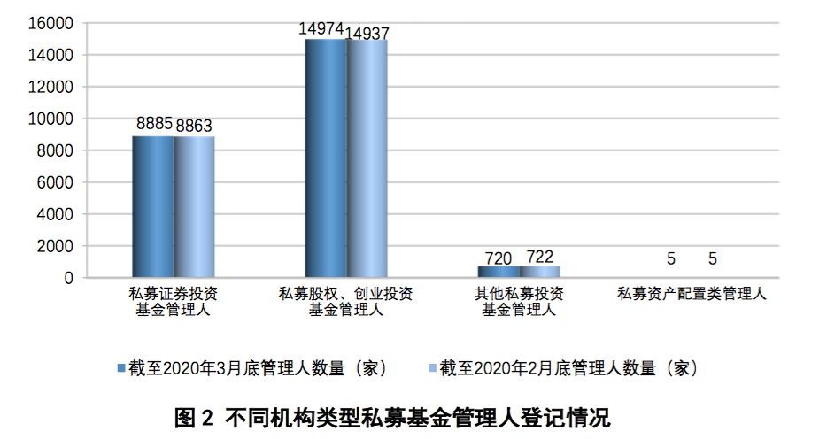 截至2020年3月底,存续登记私募证券投资基金管理人8885家,较上月增加22家;私募股权、创业投资基金管理人14974家,较上月增加37家;其他私募投资基金管理人720家,较上月减少2家;私募资产配置类管理人5家。