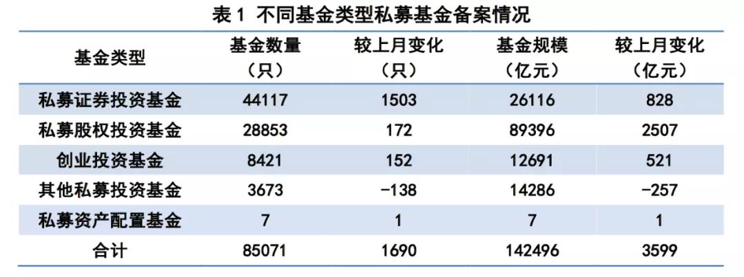 截至2020年3月底,存续备案私募证券投资基金44117只,基金规模2.61万亿元,较上月增加828.20亿元,环比增长3.28%;私募股权投资基金28853只,基金规模8.94万亿元,较上月增加2507.23亿元,环比增长2.89%;创业投资基金8421只,基金规模1.27万亿元,较上月增加520.57亿元,环比增长4.28%;其他私募投资基金3673只,基金规模1.43万亿元,较上月减少257.49亿元,环比下降1.77%;私募资产配置基金7只,基金规模6.52亿元,较上月增加6314.87万元,环比增长10.72%[7]。