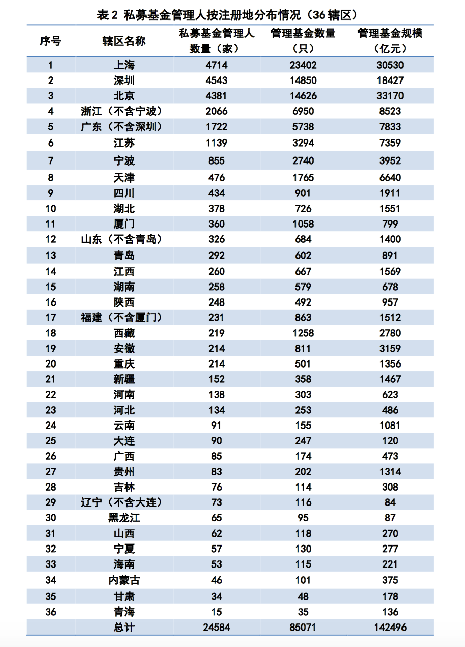 截至2020年3月底,存续登记私募基金管理人数量从注册地分布来看(按36个辖区),集中在上海、深圳、北京、浙江(除宁波)、广东(除深圳),总计占比达70.88%,略低于2月份的70.94%。其中,上海4714家、深圳4543家、北京4381家、浙江(除宁波)2066家、广东(除深圳)1722家,数量占比分别为19.18%、18.48%、17.82%、8.40%、7.00%。具体情况见下表: