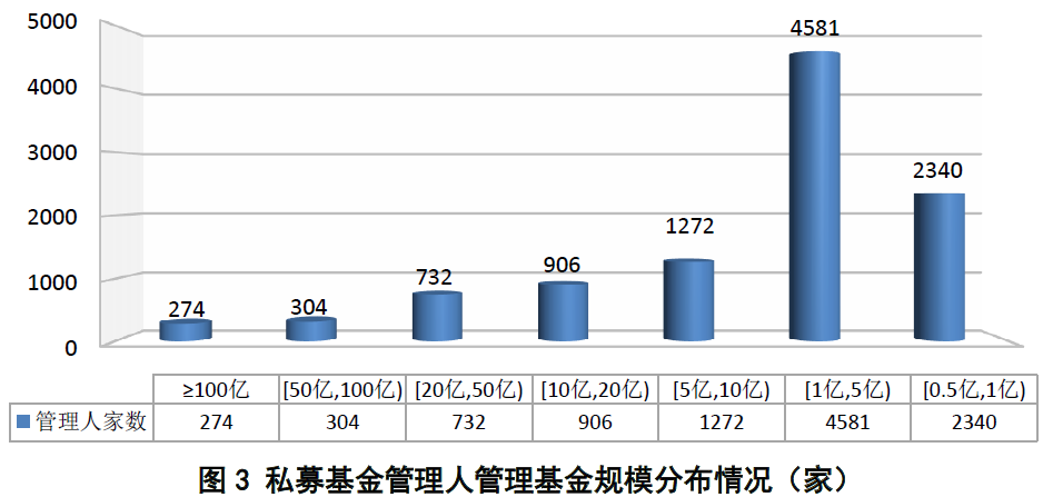 截至2020年3月底,存续登记私募基金管理人管理基金规模在100亿元及以上的有274家,管理基金规模在50亿—100亿元的有304家,管理基金规模在20亿—50亿元的有732家,管理基金规模在10亿—20亿元的有906家,管理基金规模在5亿—10亿元的有1272家,管理基金规模在1亿—5亿元的有4581家,管理基金规模在0.5亿—1亿元的有2340家。截至2020年3月底,已登记的私募基金管理人有管理规模的共21384家,平均管理基金规模6.66亿元。