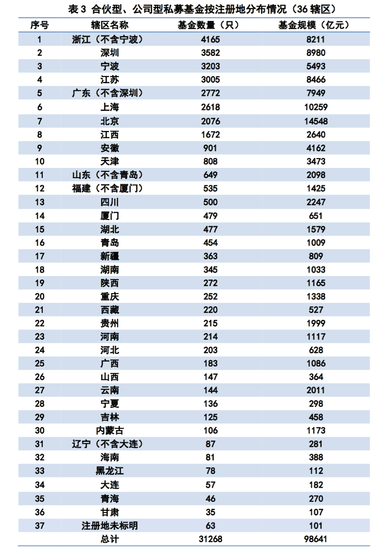 截至2020年3月底,存续备案合伙型、公司型私募基金数量从注册地分布来看(按36个辖区),集中在浙江(除宁波)、深圳、宁波、江苏和广东(除深圳),总计占比达53.50%。其中,浙江(除宁波)4165只、深圳3582只、宁波3203只、江苏3005只、广东(除深圳)2772只,数量占比分别为13.32%、 11.46%、10.24%、9.61%、8.87%。具体情况见下表:
