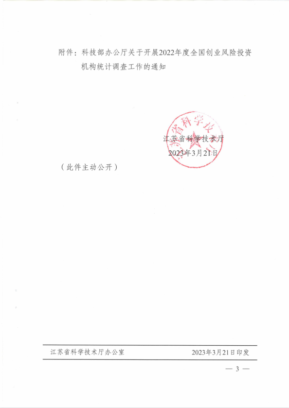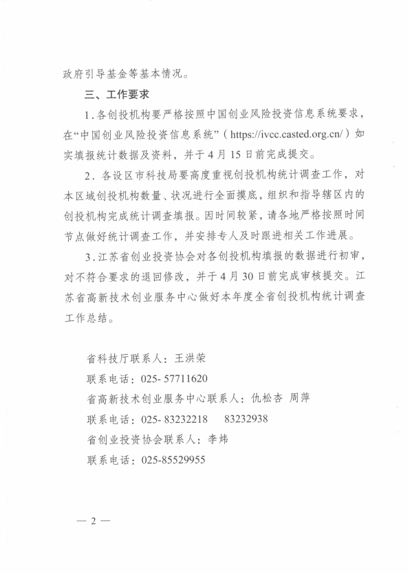 2.此次调查由省科技厅组织,并委托江苏省创业投资协会具体实施。望各有关单位加强组织领导,落实专人负责,及时、准确完成统计填报工作;