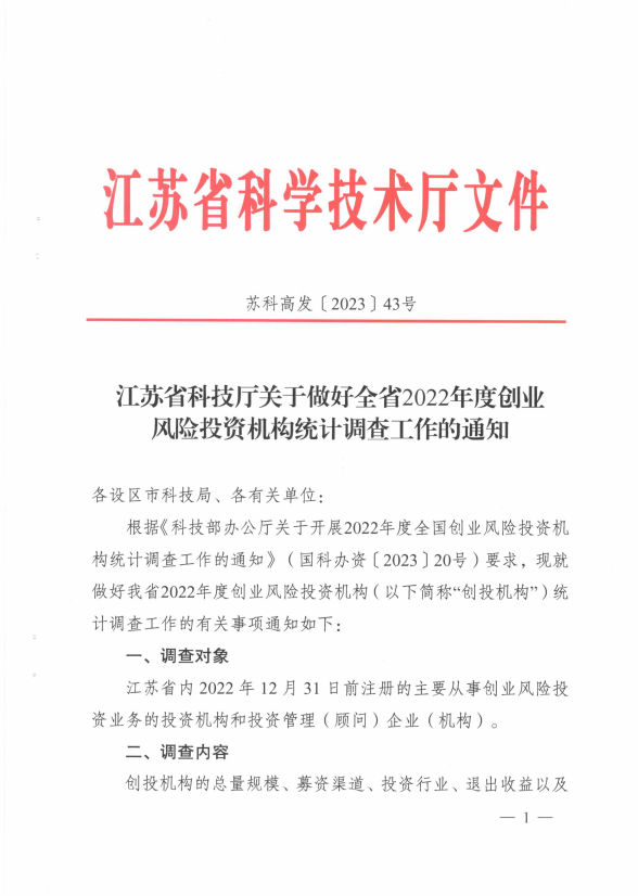 根据《科技部办公厅关于开展2022年度全国创业风险投资机构统计调查的通知》(国科办资〔2023〕20号)以及《江苏省科技厅关于做好全省2022年度创业风险投资机构统计调查工作的通知》(苏科高发〔2023〕43号) 要求,现组织我省创业风险投资机构开展2022年度创业风险投资机构统计调查工作,江苏省创业投资协会负责此项调查工作,现将有关事项通知如下:
